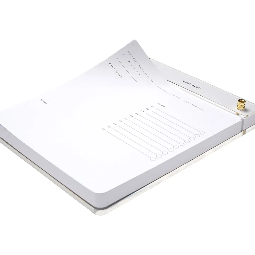 A new twist on this classic office accessory now with luxe gold detailing and acrylic backer. The Russell+Hazel acrylic drafter’s tablet features the iconic gold-toned hardware with a micro-perforated list paper pad. The 6.38″ x 8.44″ size of this notepad makes it the perfect desktop accessory to help you create and manage your daily to-dos. The paper pad is removable and held perfectly in place with delicate gold screws and it is refillable with the drafters tablet refills. Perfect for daily to-do lists, note taking, and planning.