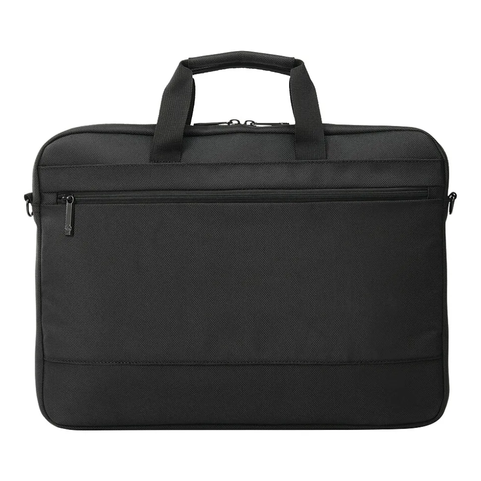 The laptop shuttle provides hands-free convenience and protection for your laptop or tablet. Slim, lightweight profile with two front zippered pockets, one quick-access pocket for smaller items, and one larger pocket to store need-it-now essentials. Wrapped bale handles provide comfort when carrying, and SmartSleeve feature fits over most upright handles for hassle-free combination travel. Adjustable, removable carry strap features a comfort pad and is sized to wear on the shoulder or across the body. Padded laptop compartment sized to fit most laptops up to 17.3″
