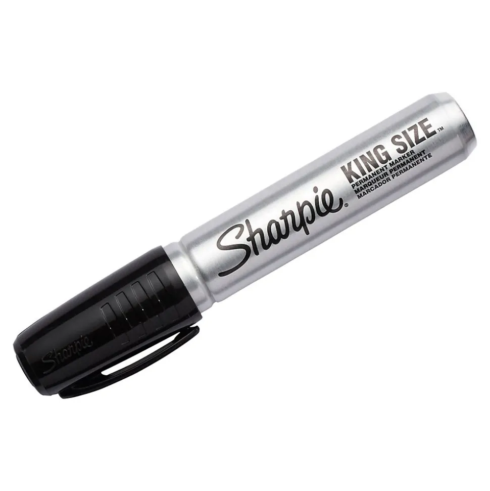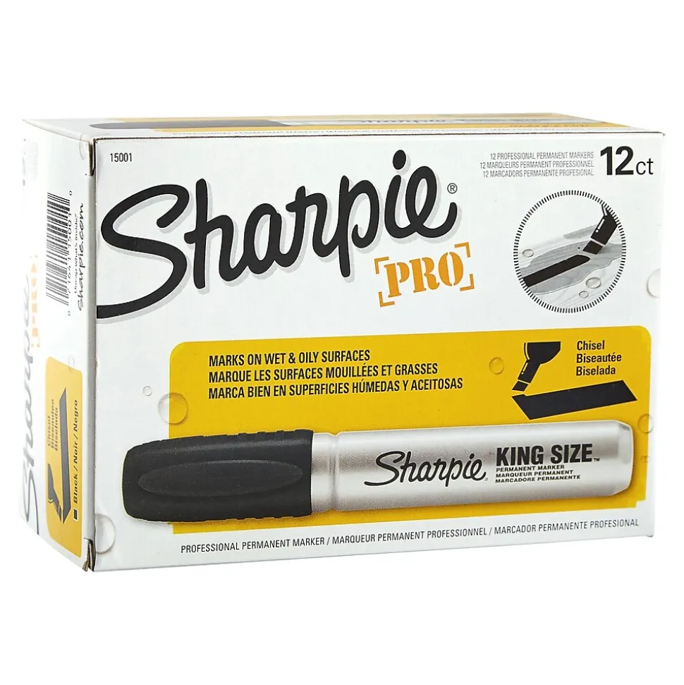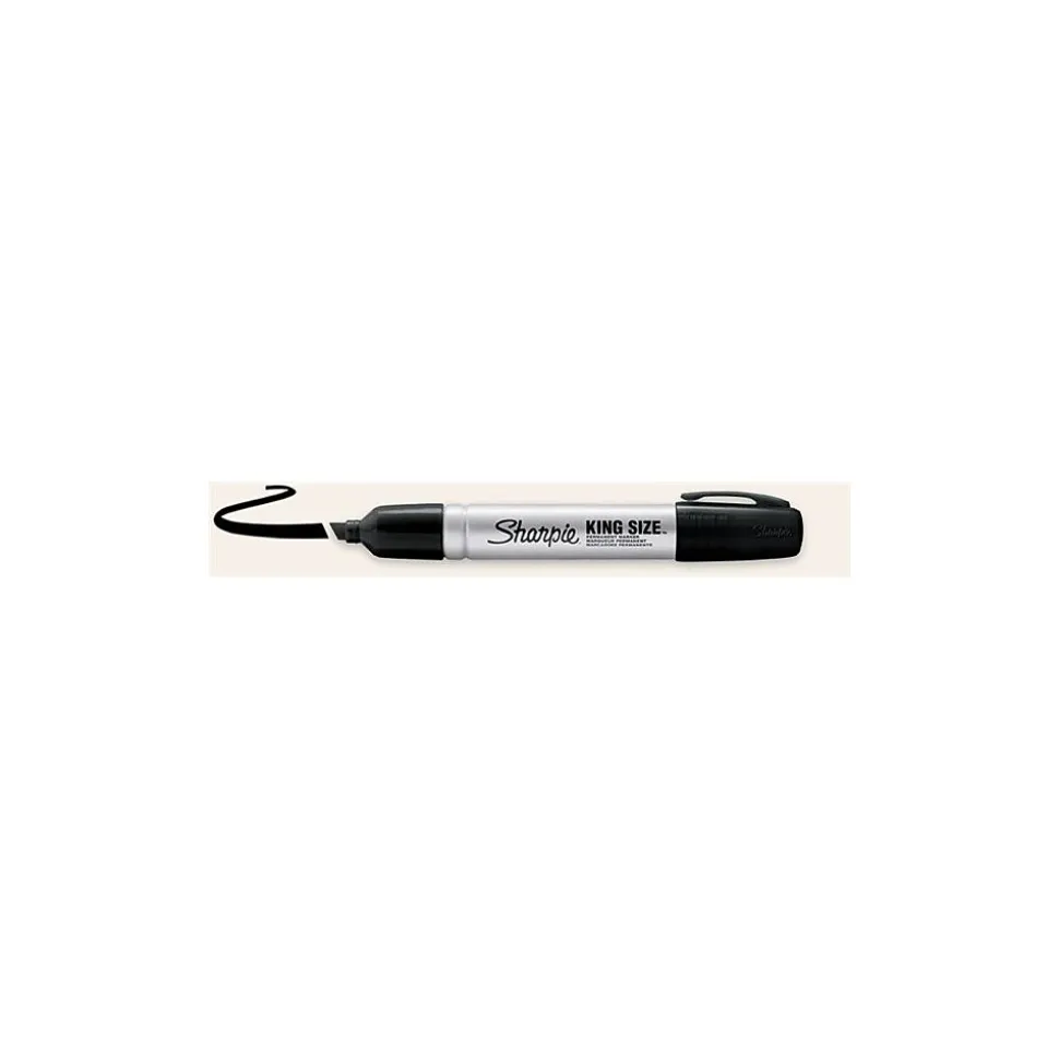 The Sharpie Pro King Size Permanent Marker is rugged for long-lasting durability. Specially made for industrial users, these bold markers write on greasy, wet, and oily surfaces while the extra durable barrel withstands heavy use. These permanent markers are built tough with an extra-large ink supply and versatile chisel tip.
