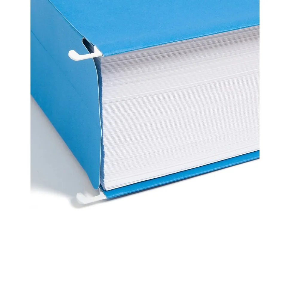 Keep large sets of paperwork together by using these letter-size hanging file pockets. Sold in a box of 25, these pockets can easily reduce clutter around the office, home, or classroom. These Smead sky-blue hanging file pockets are made with a durable bottom and sides, keeping documents contained and preventing them from slipping out when removing the pocket.