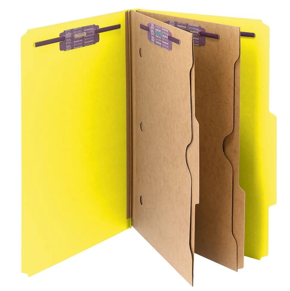 Fastener folders feature SafeShield Coated Fastener Technology the solution to fastener issues, including paper tears, finger cuts and excessive fastener crinkling. Each folder has two 2″ SafeShield Bonded style coated fasteners in positions 1 and 3. 1/3 cut tab is reinforced and 1/2″ high. Folders are made of 11 point stock and are scored for 3/4″ expansion.