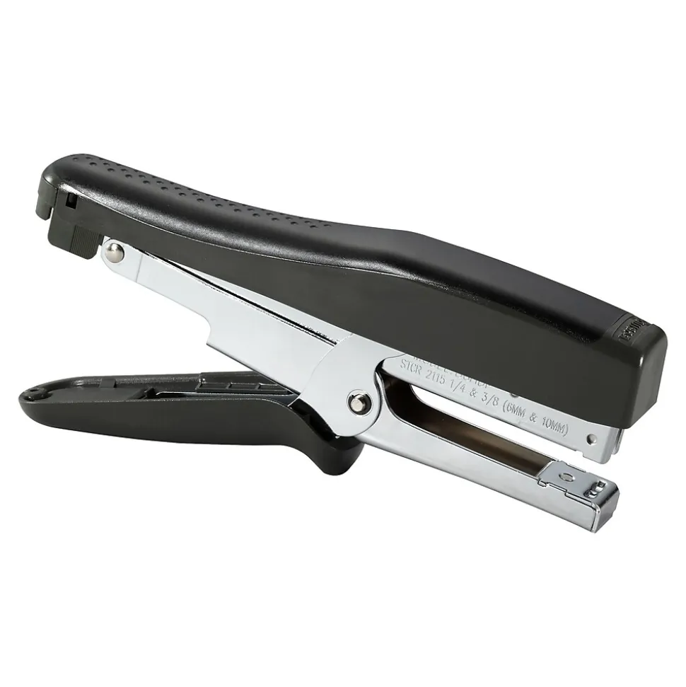 - Black in color with metal and composite construction for quality and durability. With Soft rubber handle for stapling comfort