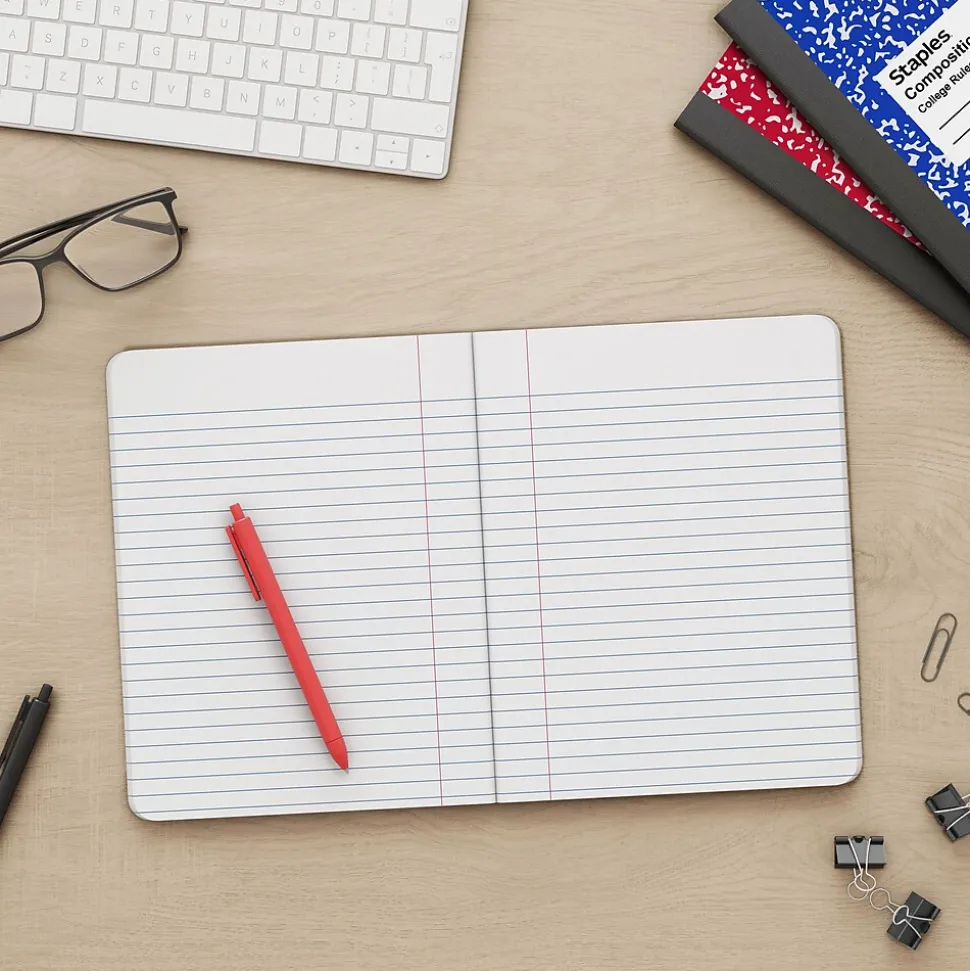 Stock up on writing paper with these 100-sheet composition books. The college ruling makes for efficient use of space and accommodates more lines of text, while the left-side wire-free binding offers easy access to information and lets you skim the pages quickly. These Staples 7.5 x 9.75-inch college-ruled marble composition books have covers in assorted colors for hassle-free organization and identification.