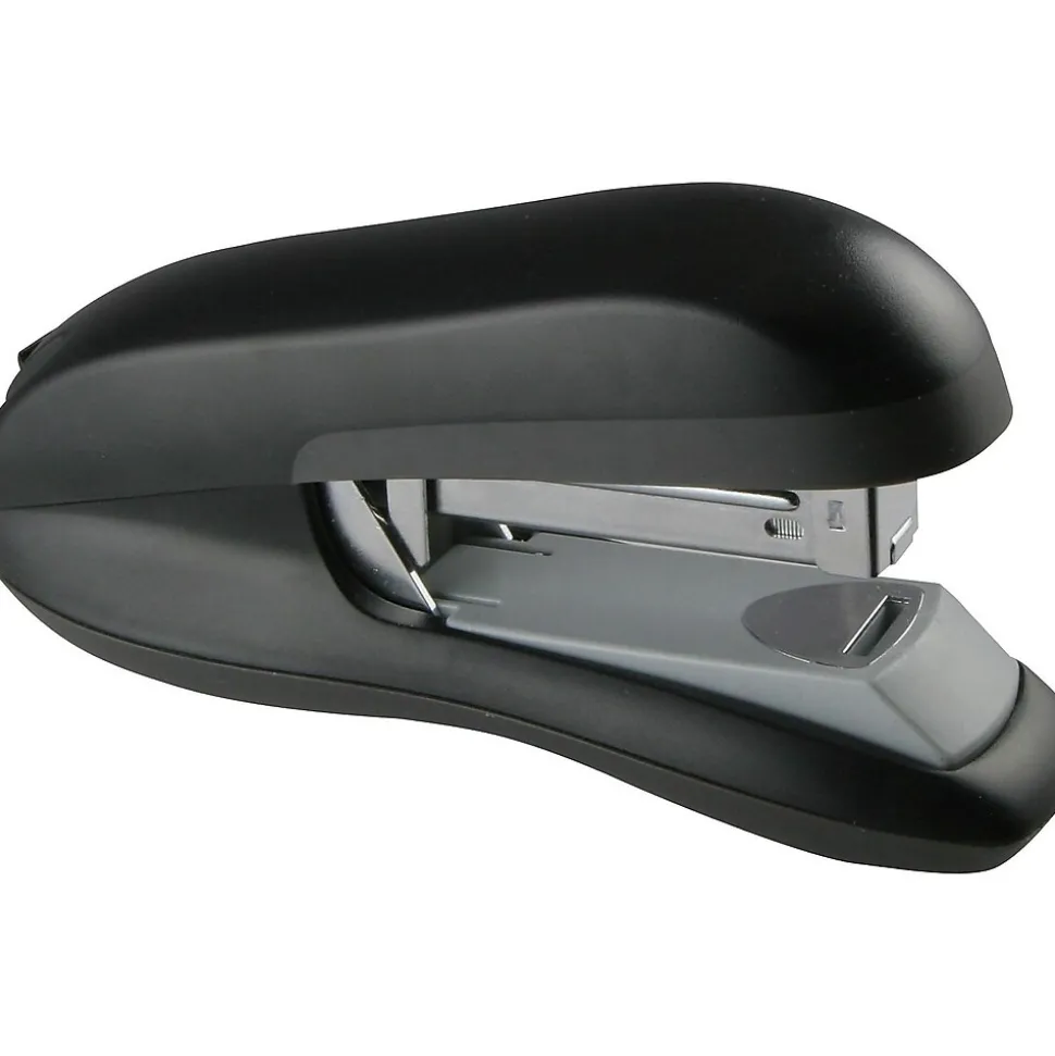 Fasten essential documents securely together with this 30-sheet-capacity black flat-stack half-strip stapler. The contoured shape provides a solid grip, while the smooth edges and black coloring provide a sleek, professional look. This Staples black half-strip stapler folds the staple to ensure flatter stacks, so piles of documents fit nicely on top of one another, while the nonskid base helps hold it steady while in use.