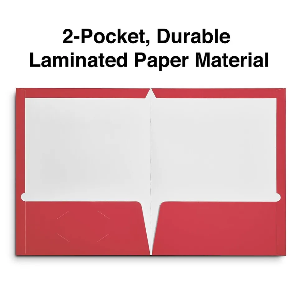 File blank forms, applications or marketing materials in these Staples two-pocket folders. The deep pockets keep your papers securely tucked inside, while the integrated business card holder makes it easy to pass out your contact information. Each folder features a bright red exterior, which offers a perfect background for custom labels and stickers. With a laminated finish, these Staples two-pocket folders resist ripping and tearing for long-lasting durability.