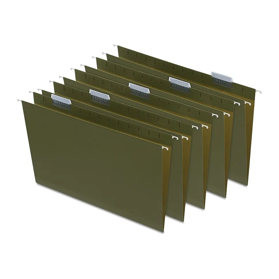 Organize manuals, brochures and bulky reference materials inside these legal-size hanging file folders. The box bottom expands up to 2 inches wide to accommodate thick files, and the standard legal size is ideal for official documents. This 25-count box of Staples box-bottom 2-inch legal-size hanging file folders features standard green paper stock to help minimize tearing and coated hangers to support easy access.