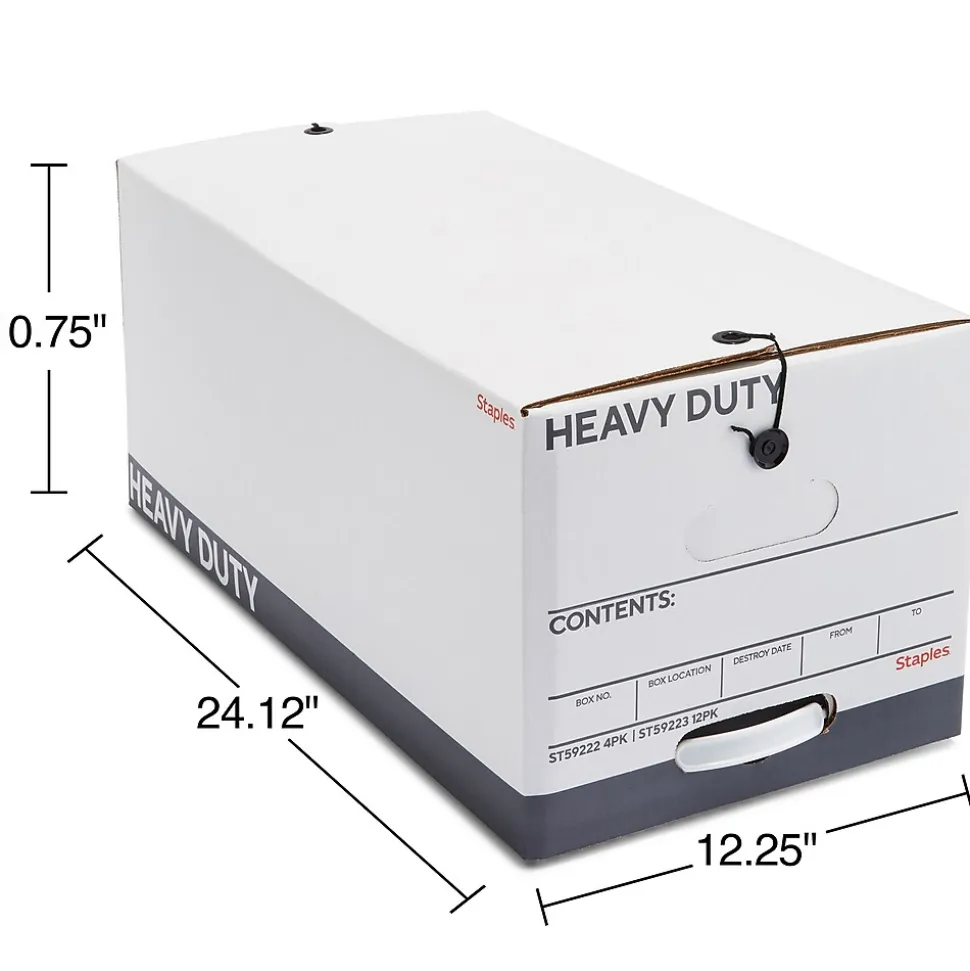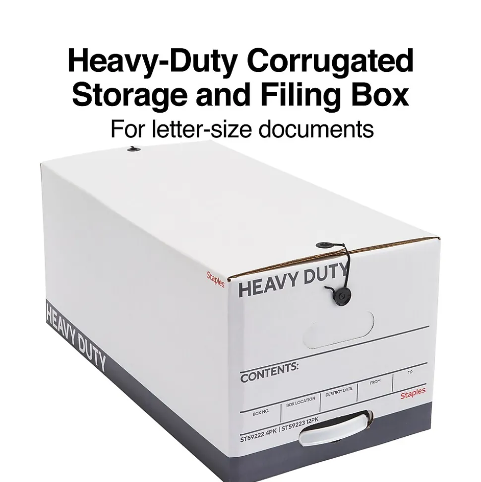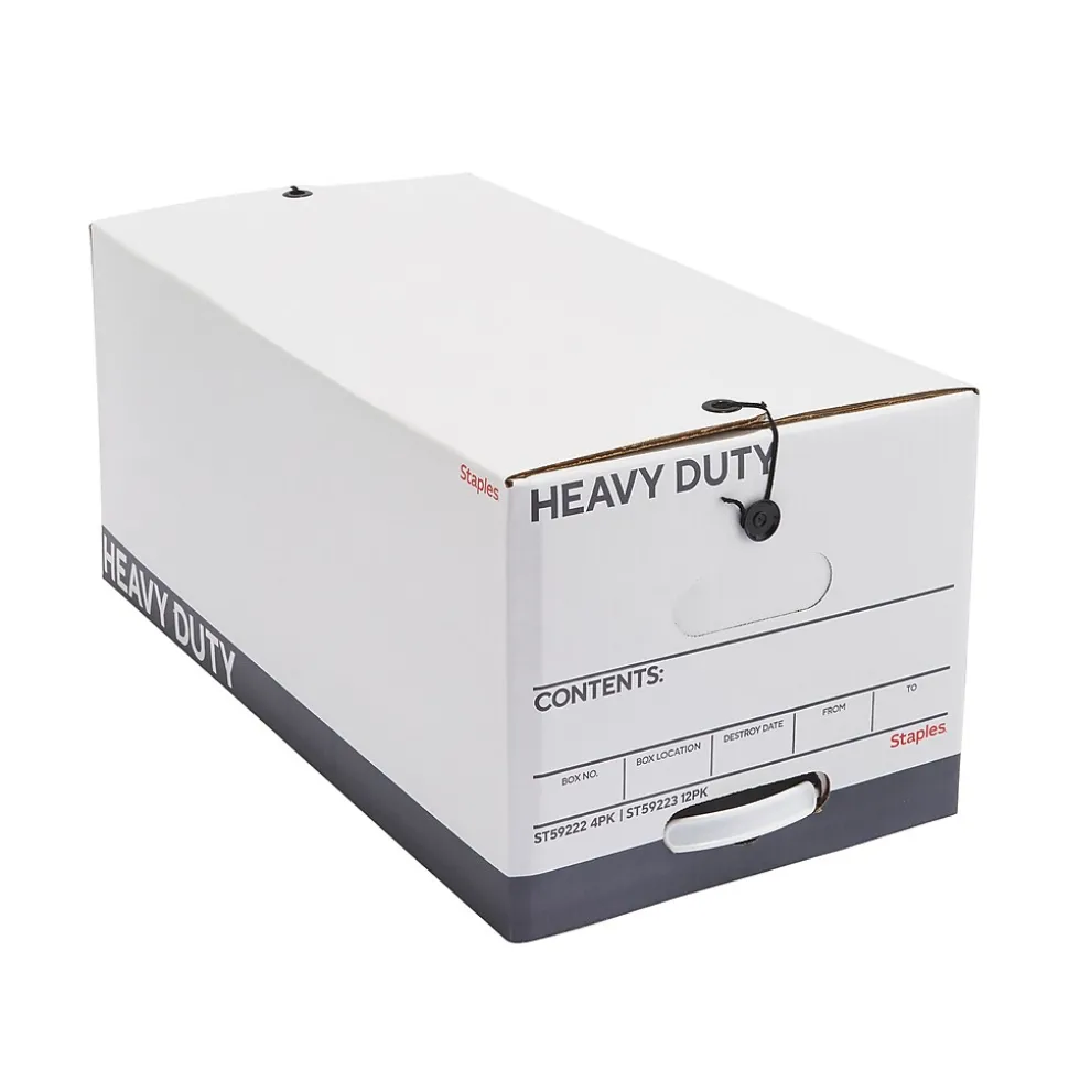 Keep your documents safe and easy to access with these corrugated storage boxes. The plastic and punch-out handles provide easy access from shelves and allow for simple movement. Featuring a heavy-duty construction, these storage boxes endure frequent handling. These Staples heavy-duty corrugated storage boxes feature a string-and-button design to secure contents and a preprinted write-in area for easy identification.