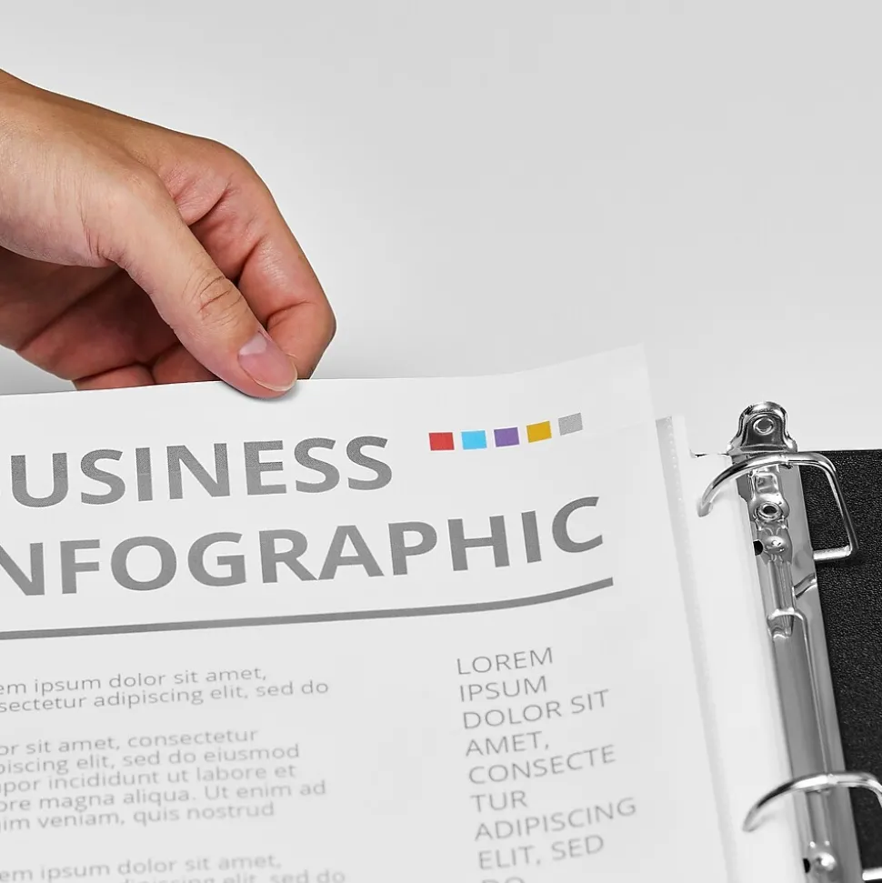 Prevent reports, forms, and other types of documents from accidental damage with these non-glare sheet protectors. The top-loading design makes it easy to insert paper, and the reinforced pre-punched edges fit neatly in standard three-ring binders. Heavyweight construction stands up to frequent page turns, making these protectors ideal for everyday use. Featuring a nonglare finish and clear construction, these Staples sheet protectors ensure documents remain readable.