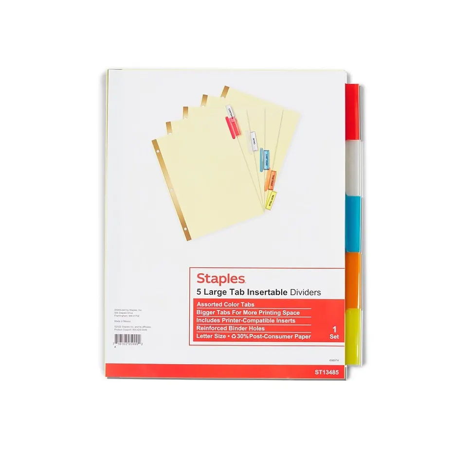 Find documents quickly with these Staples insertable Large Tab dividers. Double-sided reinforced binding edges prevent the three-punch holes from tearing, and the assorted-color tabs make it easy to categorize paperwork. The tabs feature a unique design that keeps labels securely inside for easy subject identification. These Staples insertable Large Tab dividers meets EPA guidelines with 20% recycled content.