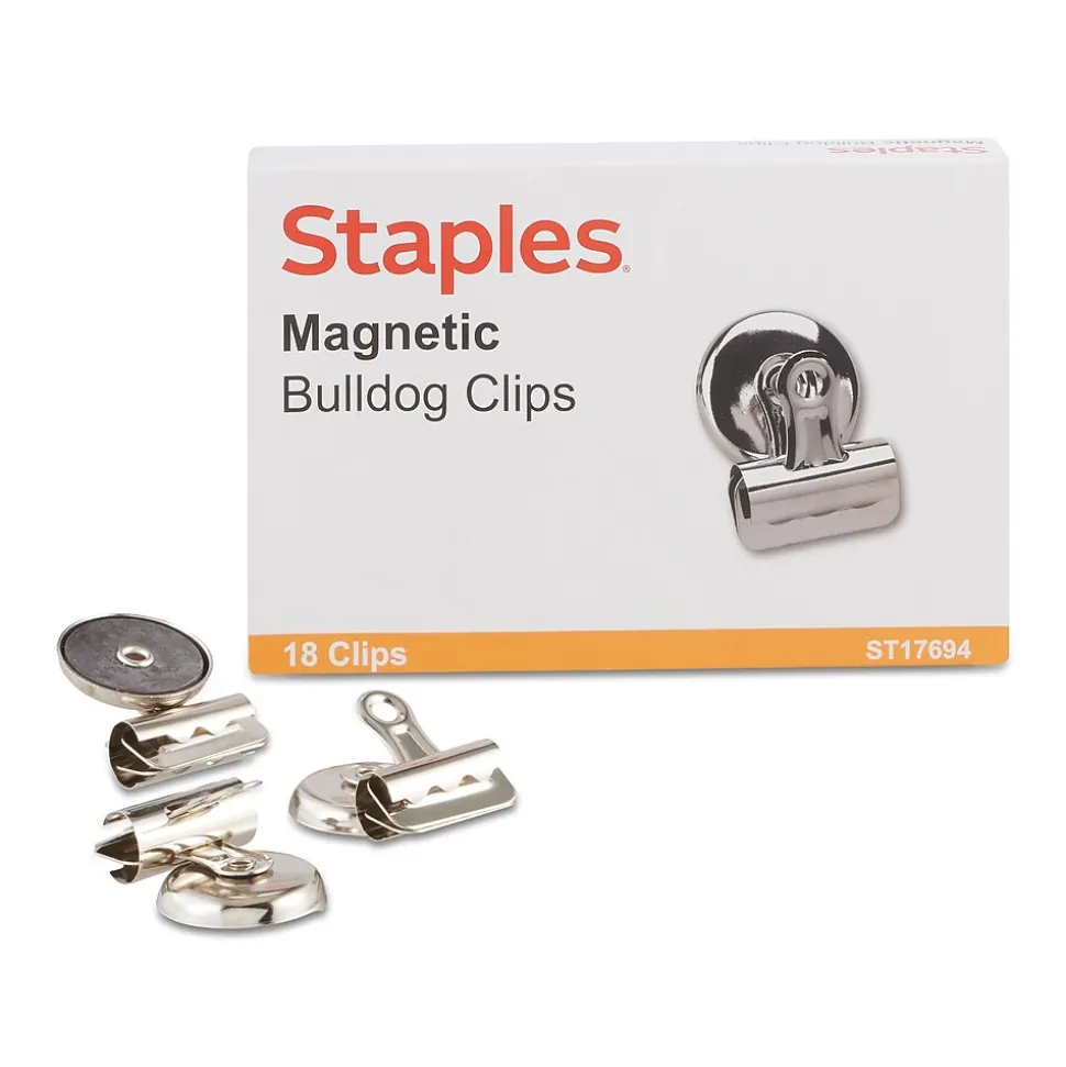 Organize documents with this 18-count pack of metallic bulldog clips. The 0.38-inch capacity accommodates stacks of papers, and the 1.25-inch clips hold contents securely to avoid lost pages. These Staples bulldog clips are magnetic to let frequently referenced paperwork hang from any convenient metal surface.