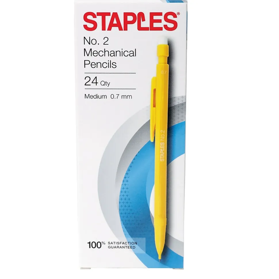 Stay on task with these Staples #2 mechanical pencils. The 0.7mm lead draws lines of medium-thickness, making this size ideal for everyday tasks such as taking notes and drawing. The pre-loaded lead doesn’t require sharpening, so you can draw for longer without interruption. The barrel features a slim design to give you more precision and control, and the vinyl eraser corrects mistakes without smudging. Each pack includes 24 mechanical pencils, so you always have one handy.