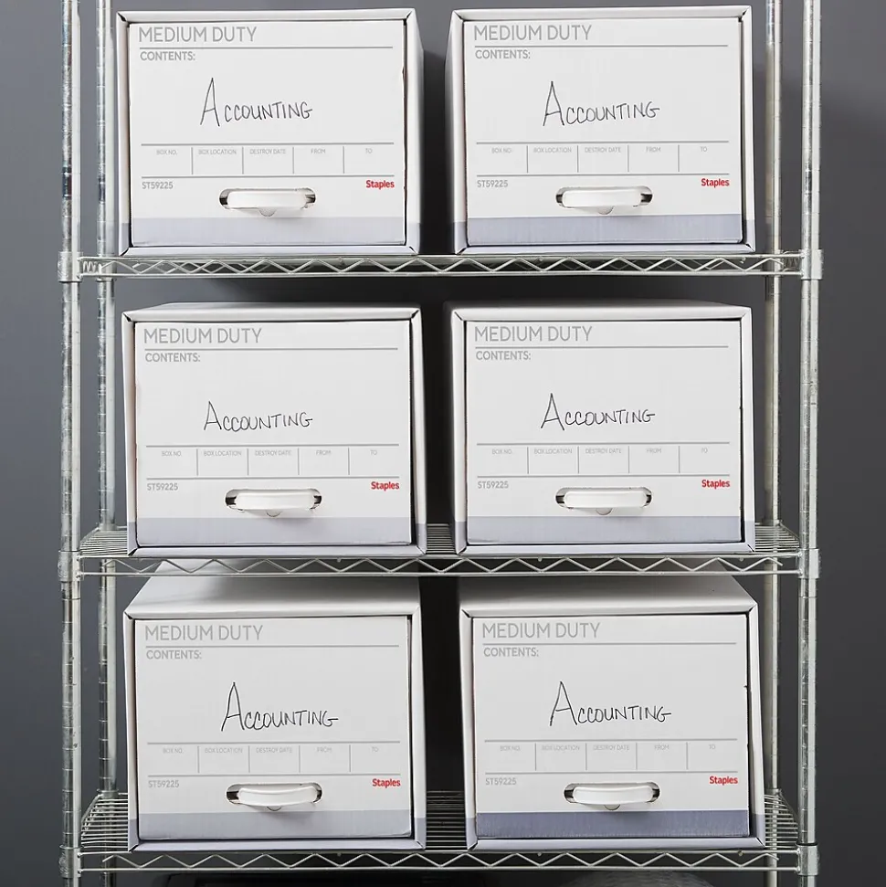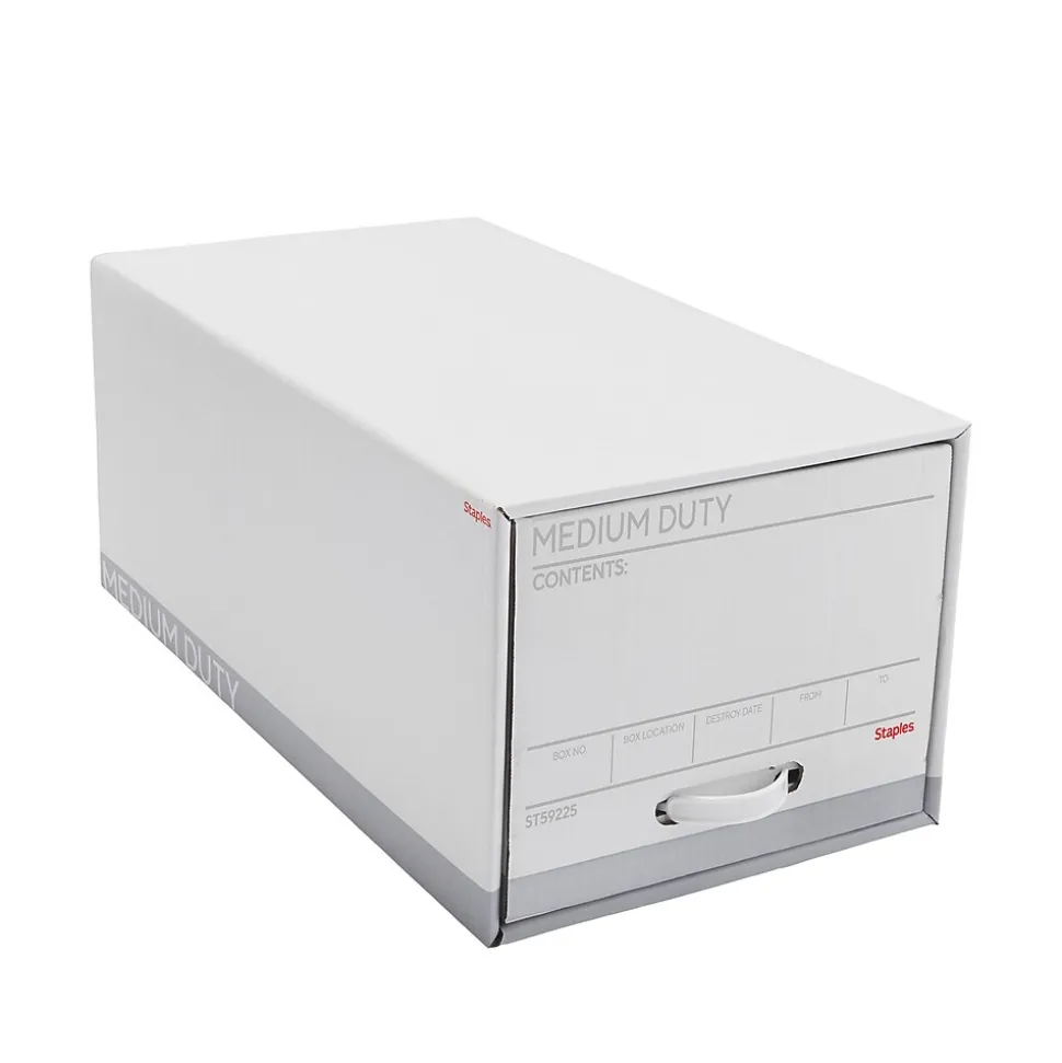 Eliminate clutter from your desk with these storage drawers. The steel support frame and medium-duty construction offer durability, while the plastic handles and drawer-style design provide easy access to stored files. A preprinted write-in area enables hassle-free labeling for quick identification. These Staples medium-duty corrugated storage drawers are stackable to save space in your records room.