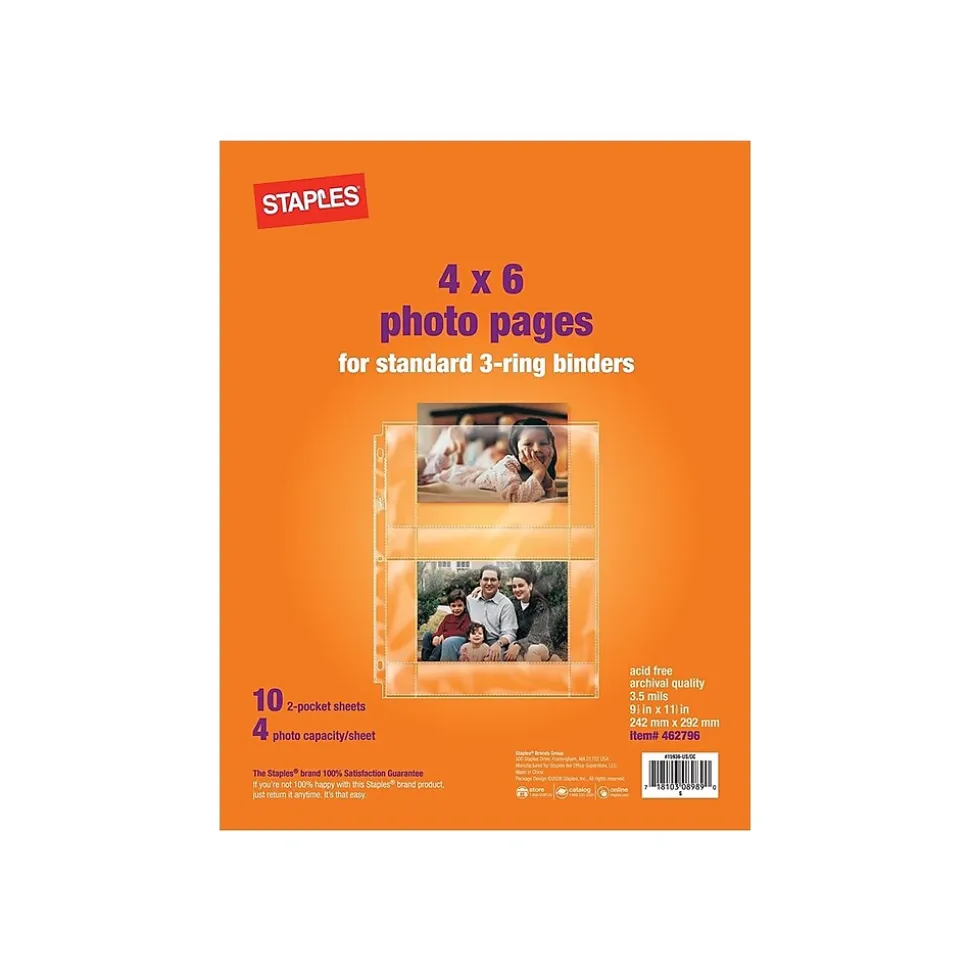 Give a long life to photos with these Staples horizontal photo protectors. Acid-free, archival-safe construction prevents ink from lifting off the images, while the conveniently sized pockets keep pictures securely in place. All pages feature a three-hole-punch design, making it easy to add them to standard three-ring binders. These Staples horizontal photo protectors boast clear construction, ensuring pictures remain clearly visible without being removed from their dedicated pockets.