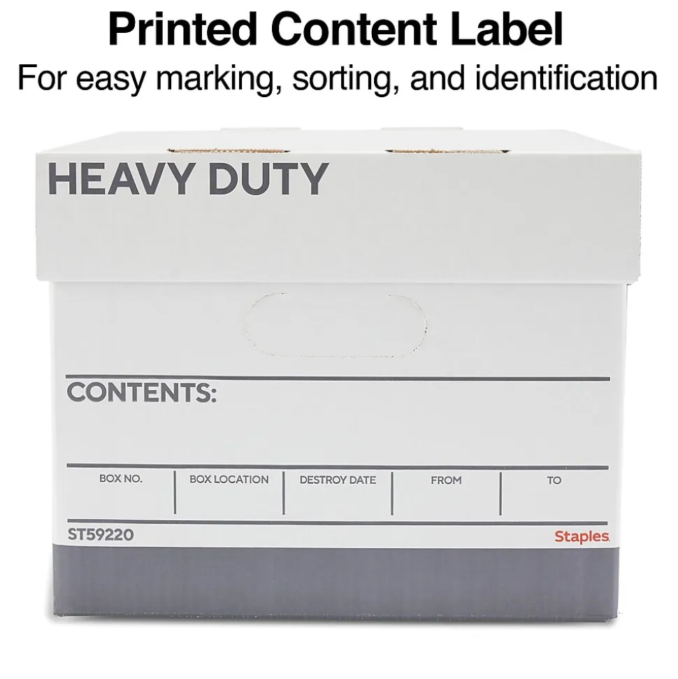 Maintain a clutter-free office space with these storage boxes. The easy-grip handles make carrying simple, while the lift-off lid helps keep stored letter-size and legal-size documents secure. With a 1500-pound stacking strength, the boxes support piling for an optimized work area. These Staples heavy-duty corrugated storage boxes are easy to set up for hassle-free filing and have preprinted write-in areas for effortless identification.