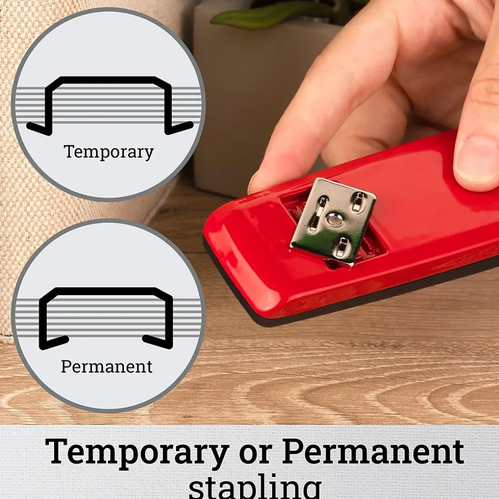 | Staple Size Staple legs are the two parallel pieces of a staple, which are designed to penetrate paper or some other material/surface. The longer the leg length, the more capacity a staple has. | 1/4 |