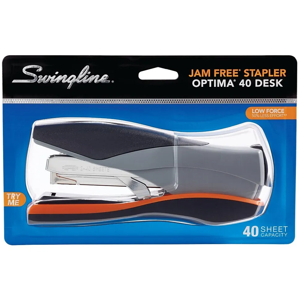 Fill this stapler quickly and easily using the QuickLoad magazine. With a capacity for 210 staples, this stapler lets you create hundreds of packets before refilling. The ergonomic construction provides a comfortable grip, and the reduced-effort design makes operation easy. This Swingline Optima 40 desk stapler produces a staple flat on the back of documents so your bundles are neat.