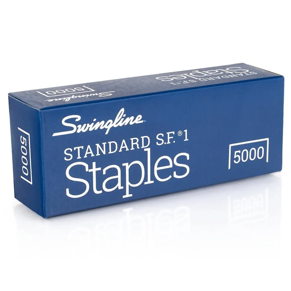A seven-point quality check ensures Swingline Standard Staples deliver dependable performance. The sharp chisel point on each staple leg guarantees less jamming and secure paper fastening. Choose these dependable staples for 15% fewer misforms than the competition. 1/4″ leg length, 210 staples per strip, 5,000 per box. Silver.