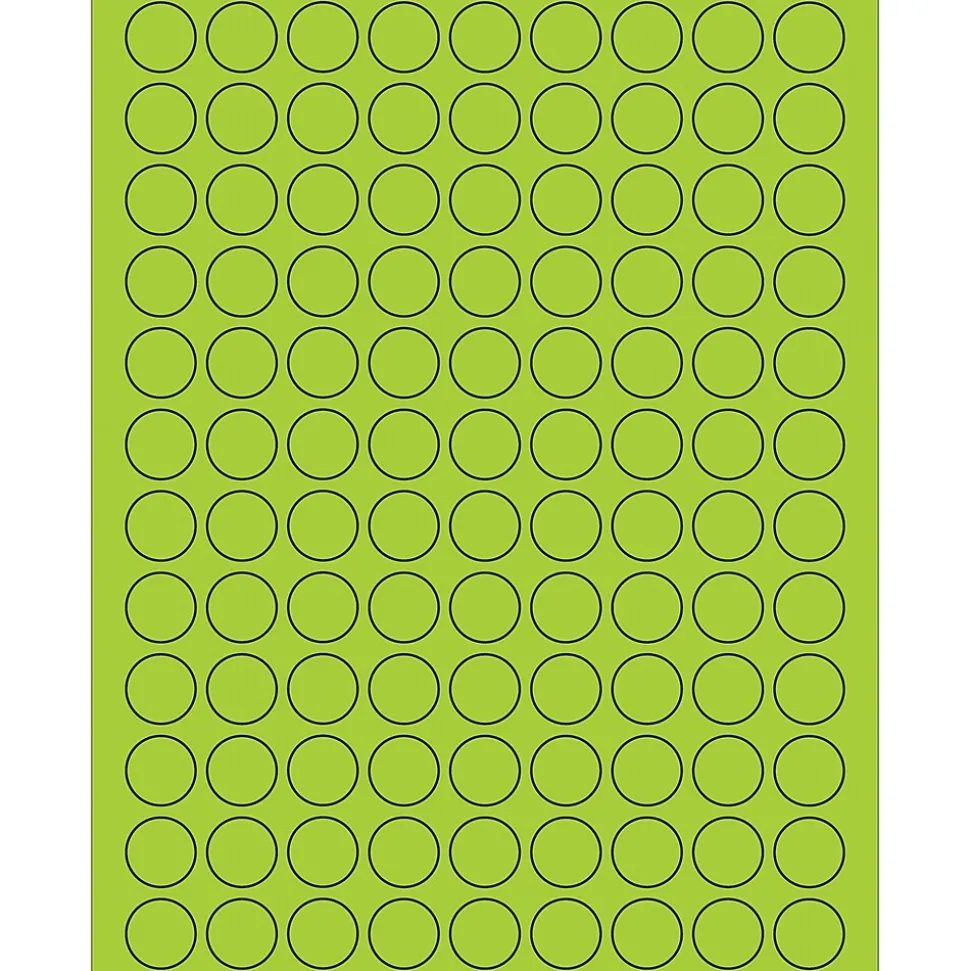 3/4″ Fluorescent Green Circle Laser Labels. Use to create your own product or mailing labels. Labels work with both laser and ink jet printers. Permanent adhesive. Labels stick to a variety of smooth surfaces including paper, corrugated, plastic, wood, glass and metal.