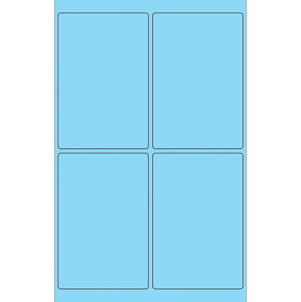 4 x 6″ Fluorescent Pastel Blue Rectangle Laser Labels. Use to create your own product or mailing labels. Labels work with both laser and ink jet printers. Permanent adhesive. Labels stick to a variety of smooth surfaces including paper, corrugated, plastic, wood, glass and metal.