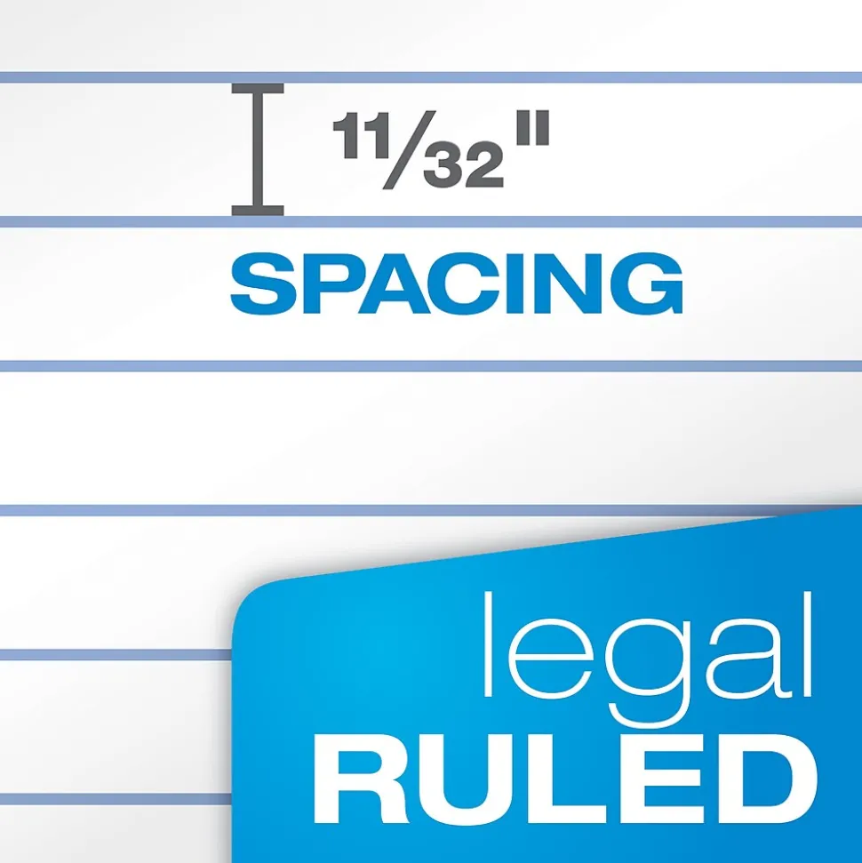 Proudly made in the USA. Twice the amount of sheets. Chipboard back. Letr-Trim® perforated. 3-hole punched. White paper. Legal/Wide rule. 8-1/2″ x 11-3/4″. 100 sheets.