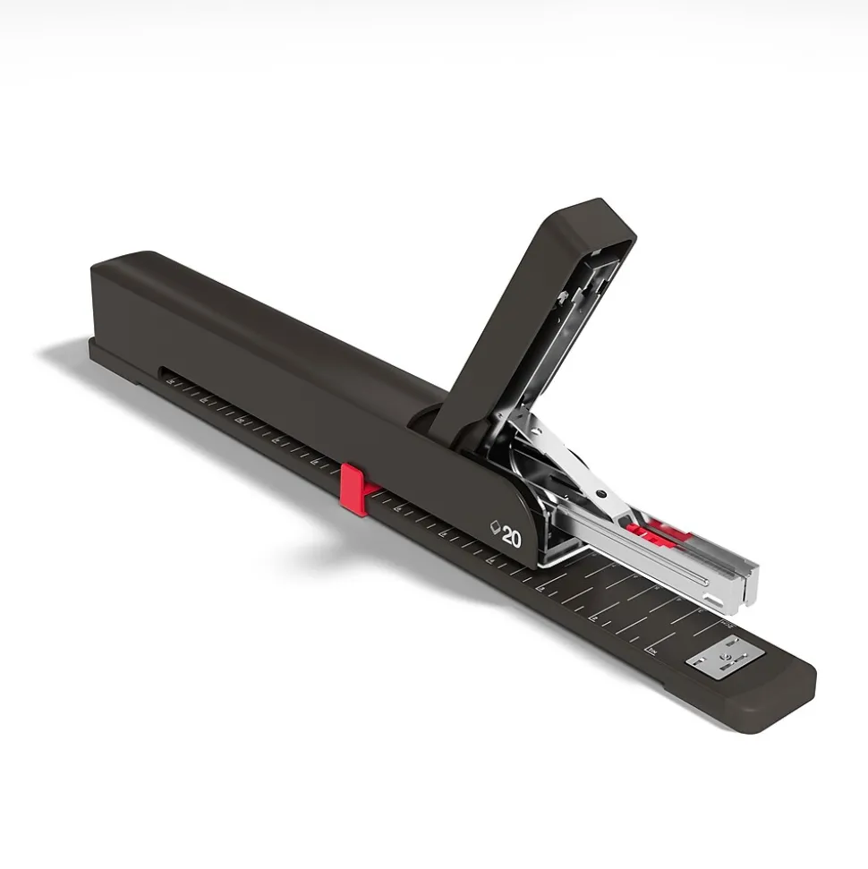 Outfit your office print station with this long-reach stapler. The rotary anvil lets you staple papers in standard mode and temporary mode, while the rubber feet deliver a firm nonslip grip for added safety. Know when it’s time to replenish the staples with the level indicator. This TRU RED long-reach stapler has a sliding paper guide for precise positioning.