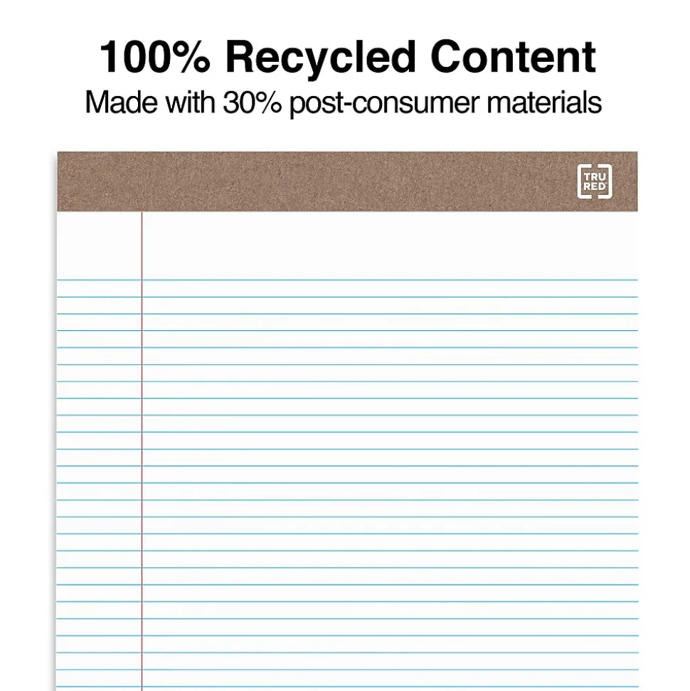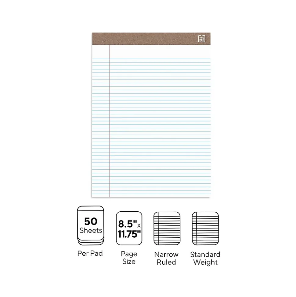 Record your thoughts, plans, and ideas on this 50-sheet ruled notepad. Narrow ruling on each page lets you write more to save space, while the top-bound construction makes it simple to flip through pages. The useful perforations allow effortless sheet removal. This TRU RED™ 8.5 x 11.75-inch white narrow ruled notepad comes in a pack of 12 for classroom or conference use.