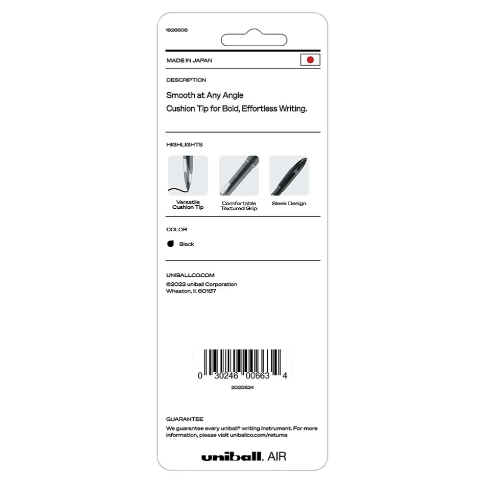 Enjoy a smooth writing experience with AIR Porous Point Rollerball Pens from uniball featuring a 0.7mm medium point. These pens have an innovative sleek tip that writes at any angle while producing crisp, skip-free lines. The porous point rollerball pens adapt to your personal writing grip style, adjusting line widths depending on the pressure of your hand as you write. Combining the fluid ink of a marker with the durability of a rollerball, these pens deliver a smooth writing experience while ensuring your documents are easy to read. Suitable for a variety of writing tasks including journaling, scrapbooking or sketching, these pens are available in assorted colors that glide easily over paper, delivering vibrant marks and lines. uni Super Ink technology ensures the ink adheres strongly to the paper, offering protection from fraud, fading and water. A glass-like plastic clip gives these fine marking pens a stylish look while adding a touch of convenience. Experience effortless writing the moment the pen hits the paper with AIR’s versatile cushion tip technology and fluid, free flowing ink.