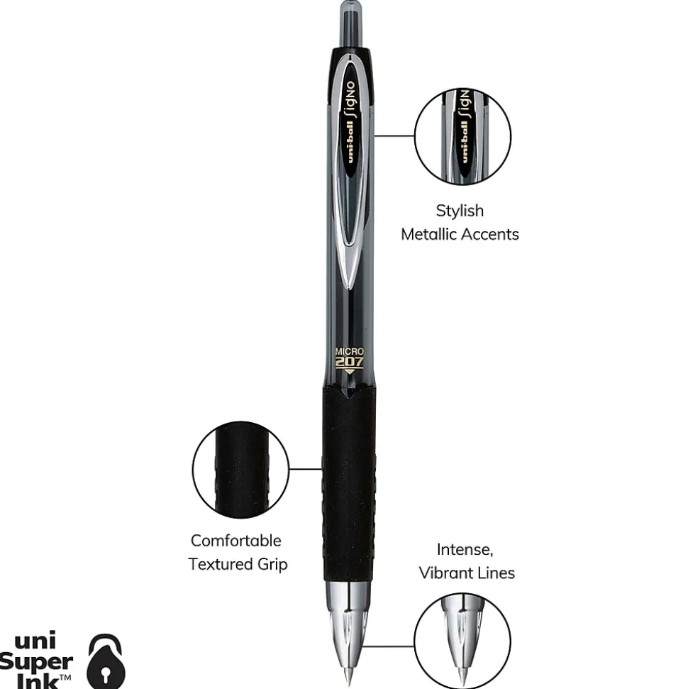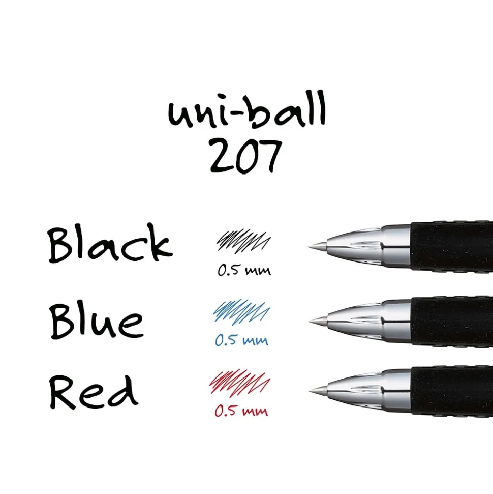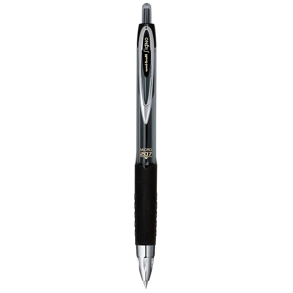 Prevent marks from smudging and smearing with this uni-ball retractable black gel pen. The 0.5mm tip is perfect for creating sharp marks for easy reading, while the retractable design prevents stray marks when not in use. This uni-ball Signo 207 retractable black gel pen has a metal clip for transporting in a pocket or notebook.