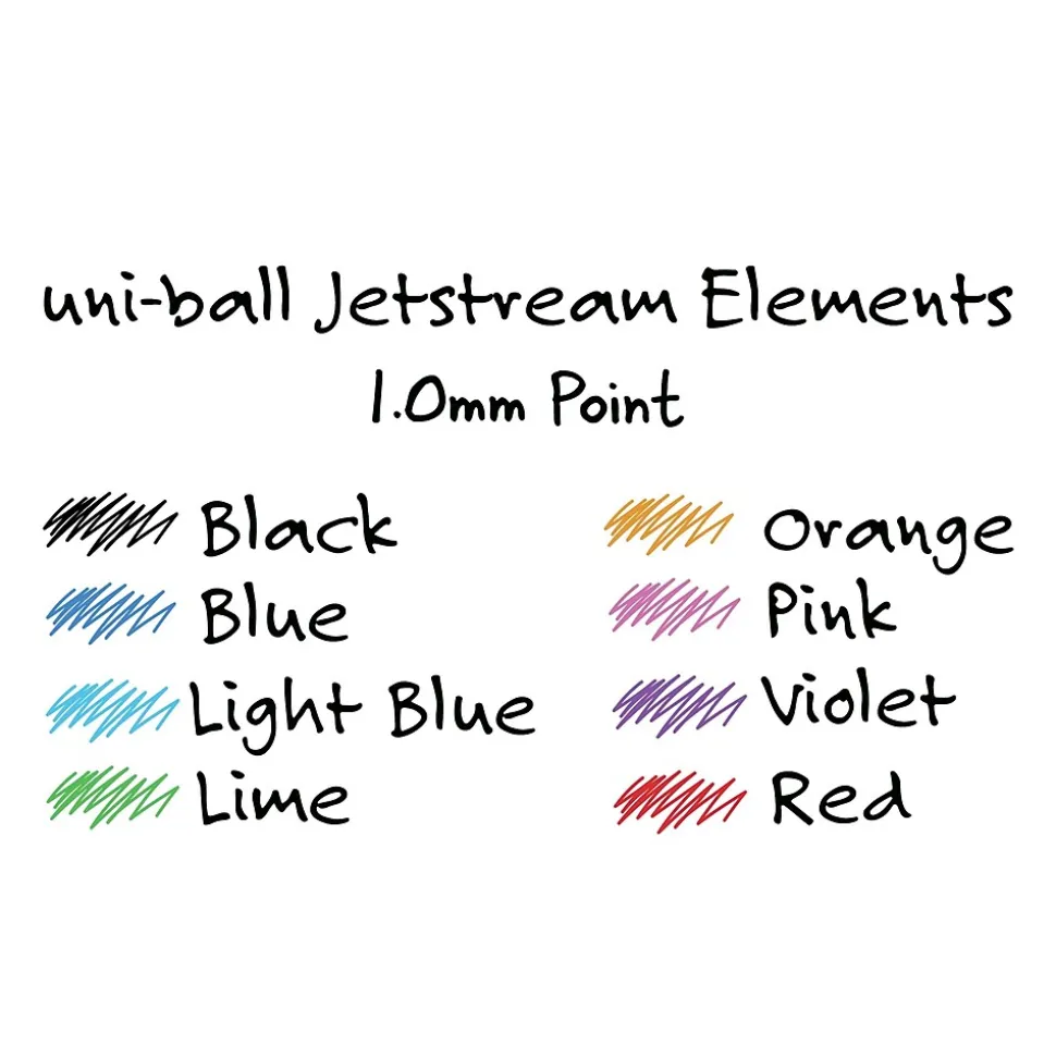 Inspire creativity with Jetstream Elements Ballpoint Pens from uniball with a 1.0mm medium point. Available in a wide assortment of colorful ink options, these pens feature an innovative hybrid ink that combines the quick-drying properties of a ballpoint with the smoothness and vibrancy of a gel pen. Whether it’s color-coding notes and lists or uniquely embellishing fun and creative writing projects, these JETSTREAM ELEMENTS ballpoint pens are suitable for a variety of projects. A contoured grip ensures greater comfort for extended writing and creating. uni Super Ink technology forms a strong bond with the paper, protecting your work from water, fading and fraud. You are simply left with exceptionally smooth and crisp lines. JETSTREAM ELEMENTS ballpoint pens give all of your ideas a burst of brilliant color.