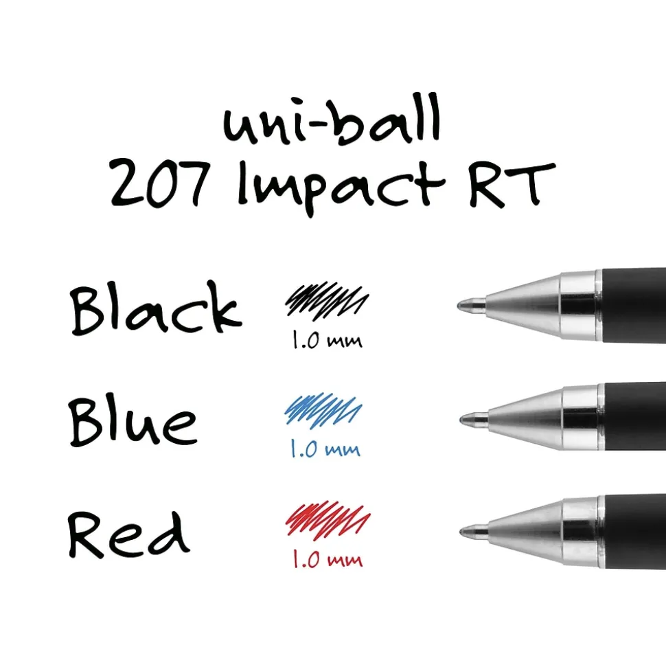 Make an impact with 207 IMPACT RT Gel Pens from uniball featuring a 1.0mm bold point with a stainless steel tip that resists bending and breaking. Even-flowing, pigment-based gel ink renders an outstanding ink laydown for a smooth writing experience and strikingly bold lines. Use these retractable gel pens for everyday writing tasks, check signing and all of your important signatures, trusting its quick-drying uni Super Ink. Exclusive uni Super Ink technology entrenches the gel ink deep into the paper, preventing document alteration, water damage or fading. The 1.0mm point delivers bold writing with a silky finish. A soft rubber grip helps you continue writing without fatigue while maintaining precision and detail throughout your tasks – and when your writing is complete, the innovative clip auto retracts the tip, protecting against unwanted gel ink marks and stains. Lend a vivid touch to your writing with these sophisticated retractable gel pens that glide smoothly for distinct and neat writing.