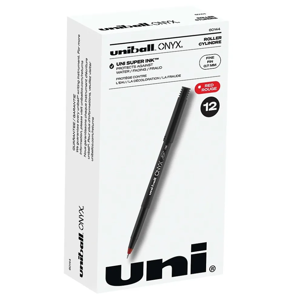 Stock your office, home or classroom with Onyx Rollerball Stick Pens from uniball featuring a strong, long lasting 0.7mm fine tip. This rollerball pen delivers the silky-smooth glide of a fountain pen without smudging for effortless writing. Fine point pens deliver crisp lines with unparalleled definition, making it easy to create super fine details in your drawings and diagrams. Capped roller pens are useful for a variety of tasks from note taking to signing checks and legal documents to uniquely embellishing fun and creative writing projects. Innovative uni Super Ink technology forms a strong bond with the paper, protecting from water, fading and fraud. A great economic and environmental choice as this super sleek fine point roller pen is made from 73% post-consumer recycled material.