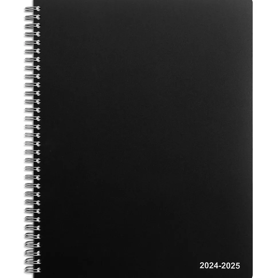 Complete office tasks with this black weekly & monthly planner. The single spiral binding holds the pages together and allows quick flip-throughs, while the poly cover material withstands daily handling. This Staples 8 x 11-inch back July 2024 to June 2025 weekly & monthly planner has 14 tabs for quick access to information and a built-in pocket for receipts and loose sheets.