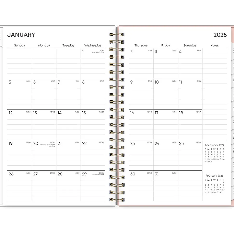 - Weekly and monthly planner covers 12 months from January 2025 to December 2025