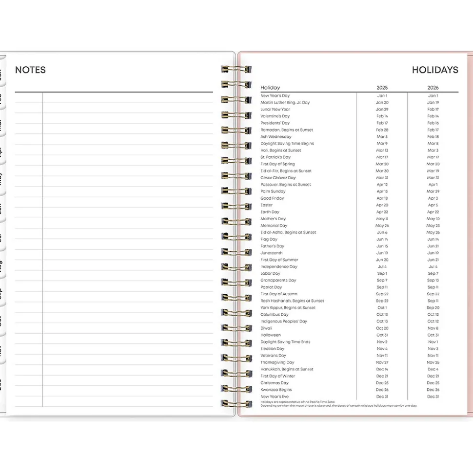 - Offers one week per two pages and one month per two pages, with space for notes and quick reference calendars