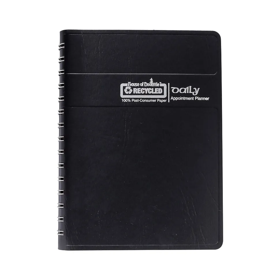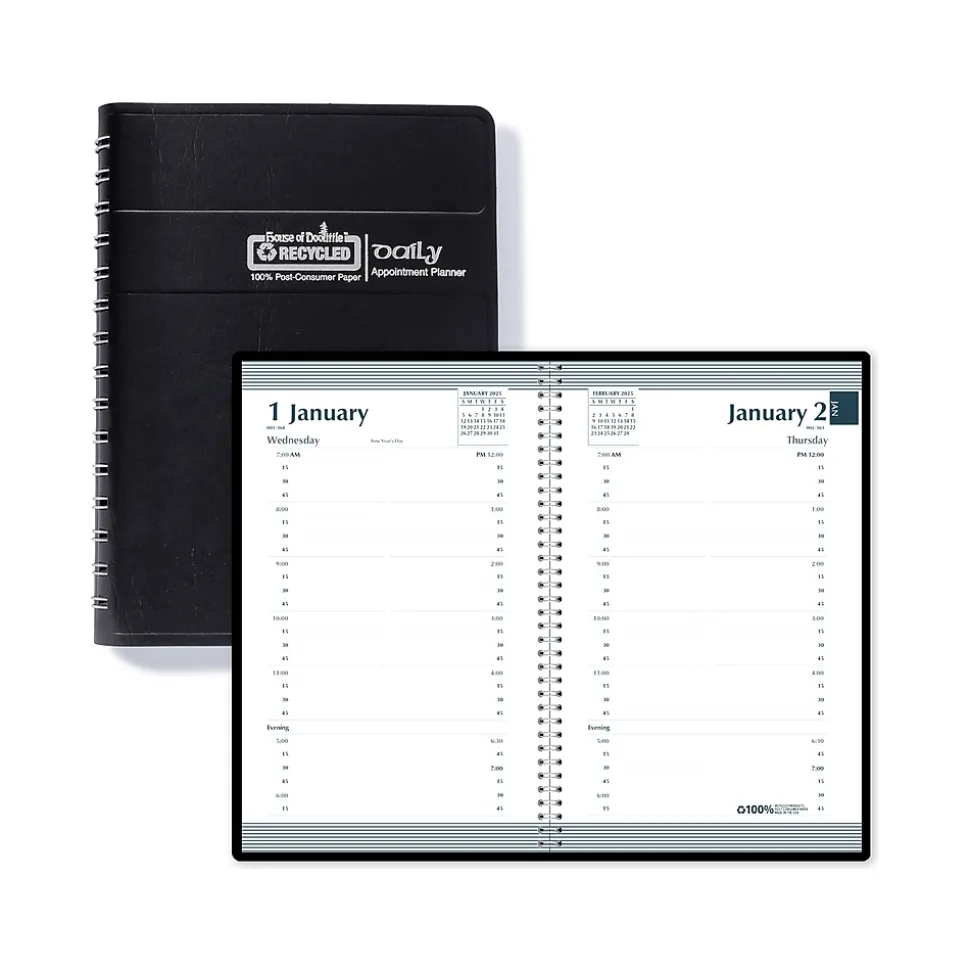 This House of Doolittle daily planner covers 12 months for easy planning, from January 2025 through December 2025. The daily pages offer quarter-hourly appointment times from 7:00 a.m. to 7:45 p.m. Spiral-bound with 90% recycled wire, the planner has a black embossed simulated leather cover. Printed with soy-based inks on 100% postconsumer recycled paper. Made in the USA and is FSC certified.