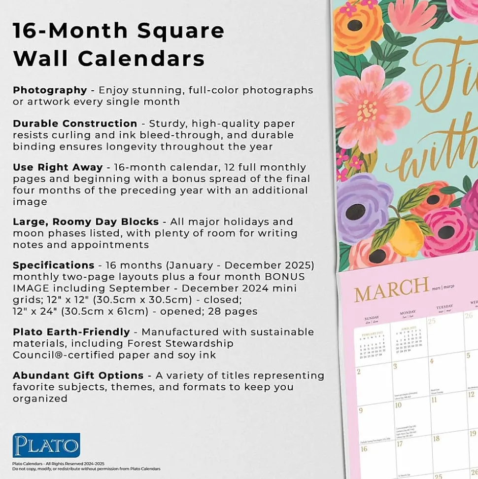 - Specifications – 16 months (two-page layout September–December 2024, and January–December 2025); 12″ x 12″ (closed); 12″ x 24″ (opened); 28 pages