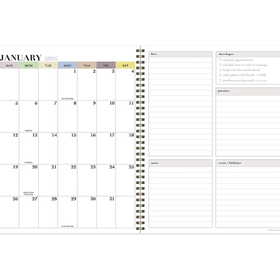 - One month per two-page spread with ruled sections for notes, tasks, and goals; one week per two-page spread with ruled daily sections, ample space for writing and notes, and a dedicated weekly priorities section to help keep you focused