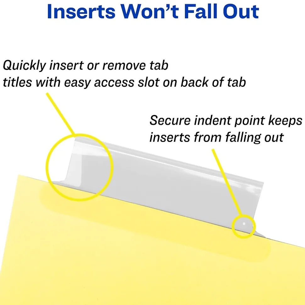 Get plenty of printing space with these insertable five-tab dividers. Each one features a unique tab design that offers easy access while preventing inserts from falling out, and the double-sided reinforced holes provide additional durability. These Avery Big Tab five-tab dividers let you customize inserts with free Avery Design & Print templates to create a professional appearance.