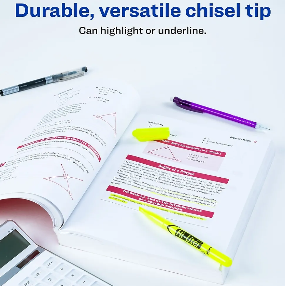 Use these fluorescent yellow chisel-tip pen-style highlighters to make key points stand out. These Avery Hi-Liter fluorescent yellow highlighters feature a chisel-tip design that lets you create thin and thick lines depending on the angle for underlining or highlighting important text.