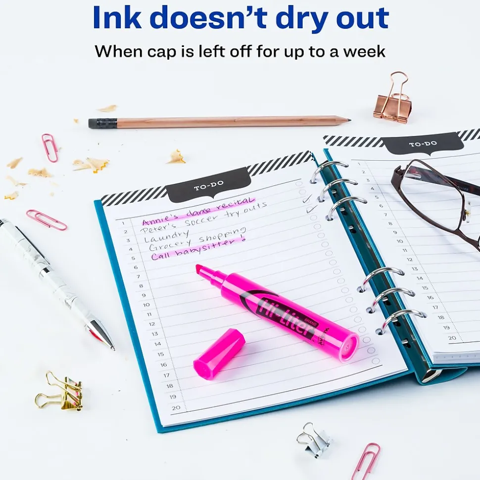 Prepare notes, research materials or index cards with these desk-style highlighters. The nontoxic ink is ideal for use in both offices and classrooms, while the fluorescent pink color stands out for better visibility. These Avery Hi-Liter chisel-tip highlighters resist smearing and smudging to keep papers clean.