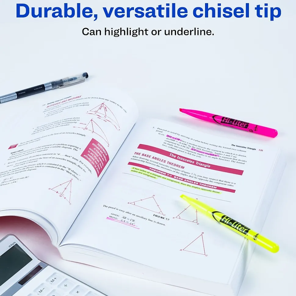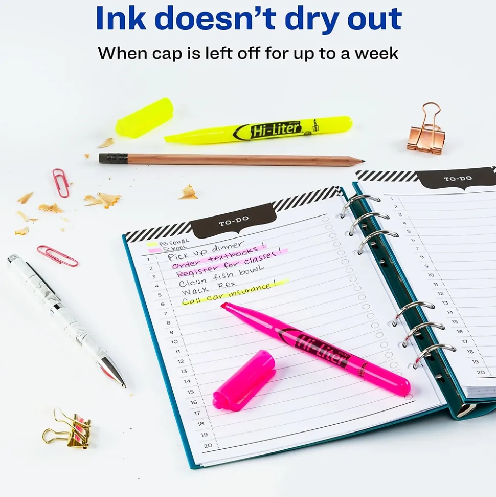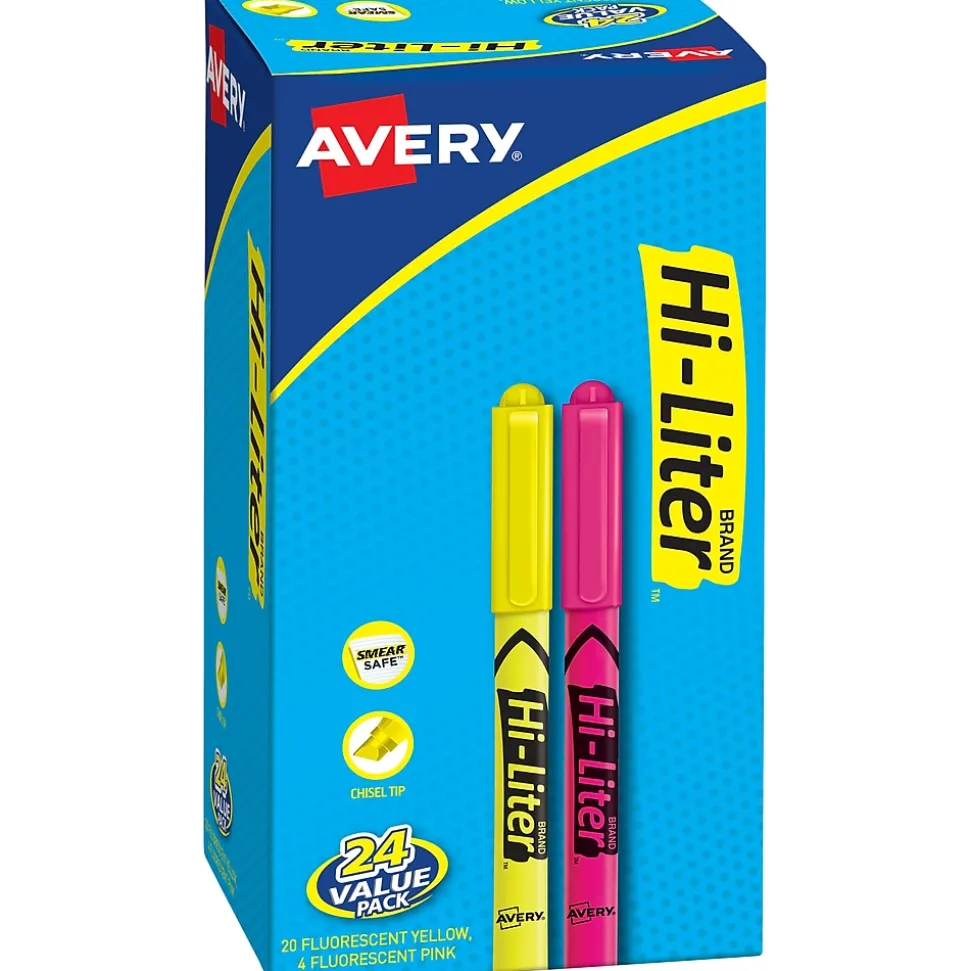 Keep track of important ideas and concepts with these fluorescent highlighters. The chisel tips make it easy to create fine lines or broad strokes, while the pink and yellow hues let you color-code information. These Avery Hi-Liter pen-style highlighters feature slim round barrels for a comfortable grip.
