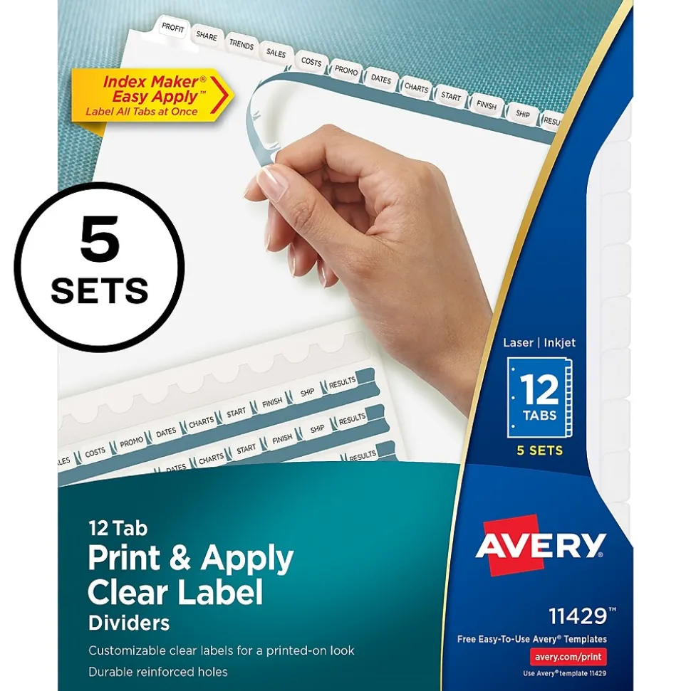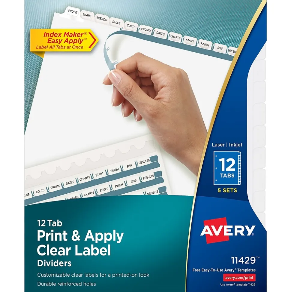 Easily create print shop quality personalized binder dividers with tabs with Avery Index Maker Clear Label Dividers. Customize the title tabs for your dividers quickly and easily using the free templates on the Avery website and print with your inkjet or laser printer for clean, professional looking results in minutes. This pack comes with five sets of 12-tab dividers, and the Easy Apply clear label strips make it simple to apply all 12 labels of each set at once. Just print, align labels against tabs, smooth down labels and peel up strip. Each 3-hole punched durable divider also features doubled-sided, reinforced tabs and edges to help resist tearing for long-lasting, everyday use. These 3 ring binder dividers with tabs are a great addition to your medical office supplies, school binders, personal organizers, tax office supplies, presentation reports and more. Print, peel, and press your way to a perfect, precise project.