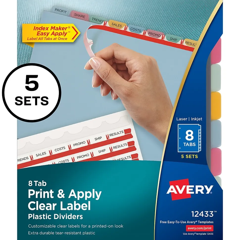 Don’t waste time and money ordering custom printed binder dividers with tabs when you can easily create and print your own personalized dividers with Avery Index Maker Clear Label Dividers. Customize your title tabs quickly and easily using the free templates on the Avery website and print with your inkjet or laser printer for clean, professional looking results in minutes. This pack comes with 5 sets of 8-tab dividers, and the Easy Apply clear label strips make it simple to apply all 8 labels of each setat once. Just print, align labels against tabs, smooth down labels and peel up strip. The white binder dividers feature an assortment of colored tabs for eye-catching convenience when you’re looking for the right section. Each 3-hole punched durable divider is tear resistant and provides extra strength for long-lasting, everyday use. These 3 ring binder dividers with tabs are a great addition to your medical office supplies, school binders, personal organizers, tax office supplies, presentation reports and more. Print, peel, and press your way to a perfect, precise project.