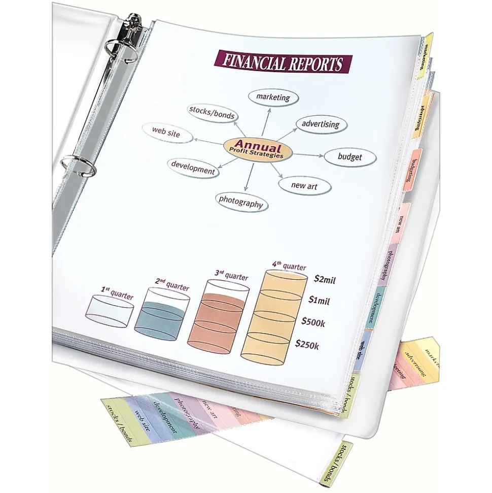 Bring a professional look to reports, proposals or other document collections with these eight-tab sheet protectors. The multicolor tabs make it easy to find papers stored inside binders, while the durable polypropylene construction stands up to frequent handling. Each of these Avery Protect ‘n Tab sheet protectors features prepunched edges and a top-loading design for simple setup.