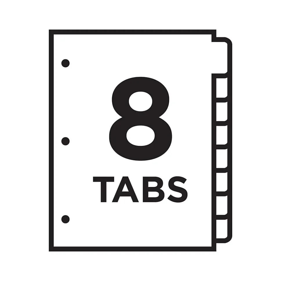 Organize your projects in moments with Avery Ready Index 8-tab dividers. Each tab is preprinted and uniquely color coded for a professional appearance. Print your own custom section titles and images onto the table of contents sheet without worrying about labels or inserts. Whether you’re creating planners for classes or hosting a presentation, these dividers are ideal for getting everything sorted.6 sets of 8 tabbed dividers are included with each sheet measuring 8-1/2″x11″. The 3 binder holes are reinforced on both sides of the heavyweight sheet to prevent creasing and tearing. Each divider tab includes additional reinforcement along the edge of each page to distribute stress and resist folding.The printable table of contents is dual compatible with both laser and inkjet printers. This sheet can also be printed in either portrait or landscape so that your projects can be displayed in any orientation. Just flip the sheet to view the other layout on the opposite side. Try out free templates for these dividers and check out the Avery Design & Print software at avery.com/templates.