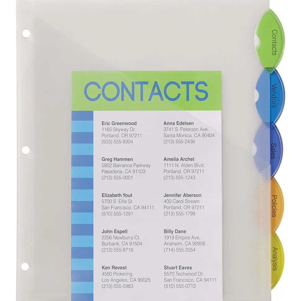 - Store loose papers and unpunched sheets within the front pocket of each 5-tab binder dividers