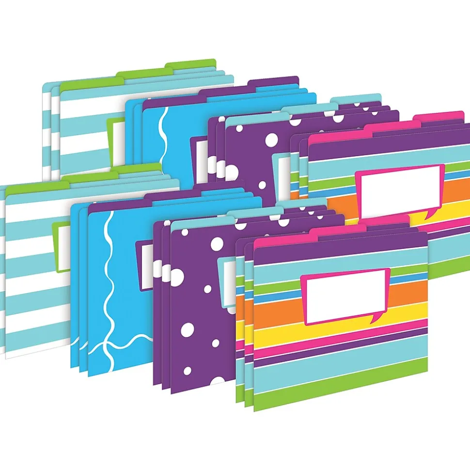 Barker Creek’s Happy Letter-Size File Folders are an affordable way to organize your office, classroom, or home with style and flair. This set of stylish desk accessories includes 24 file folders – six each of four colorful designs. The folders are 1/3 tabbed, which means that they have three tab positions – eight folders are tabbed on the left, eight folders are tabbed in the center, and eight are tabbed on the right.The 14-point stock makes these folders perfect for desktop filing, meeting handouts, and student papers. These Happy file folders come with a preprinted “label” on the front for adding a table of contents, highlighting meeting agendas, listing the names of team members, bulleting travel itineraries, and so much more. These unique office supplies are fully reversible, each folder having a multicolored design on one side and a soft, solid color on the reverse side. The possibilities are limited only by your imagination! Coordinating products are available. Search: Barker Creek Happy.
