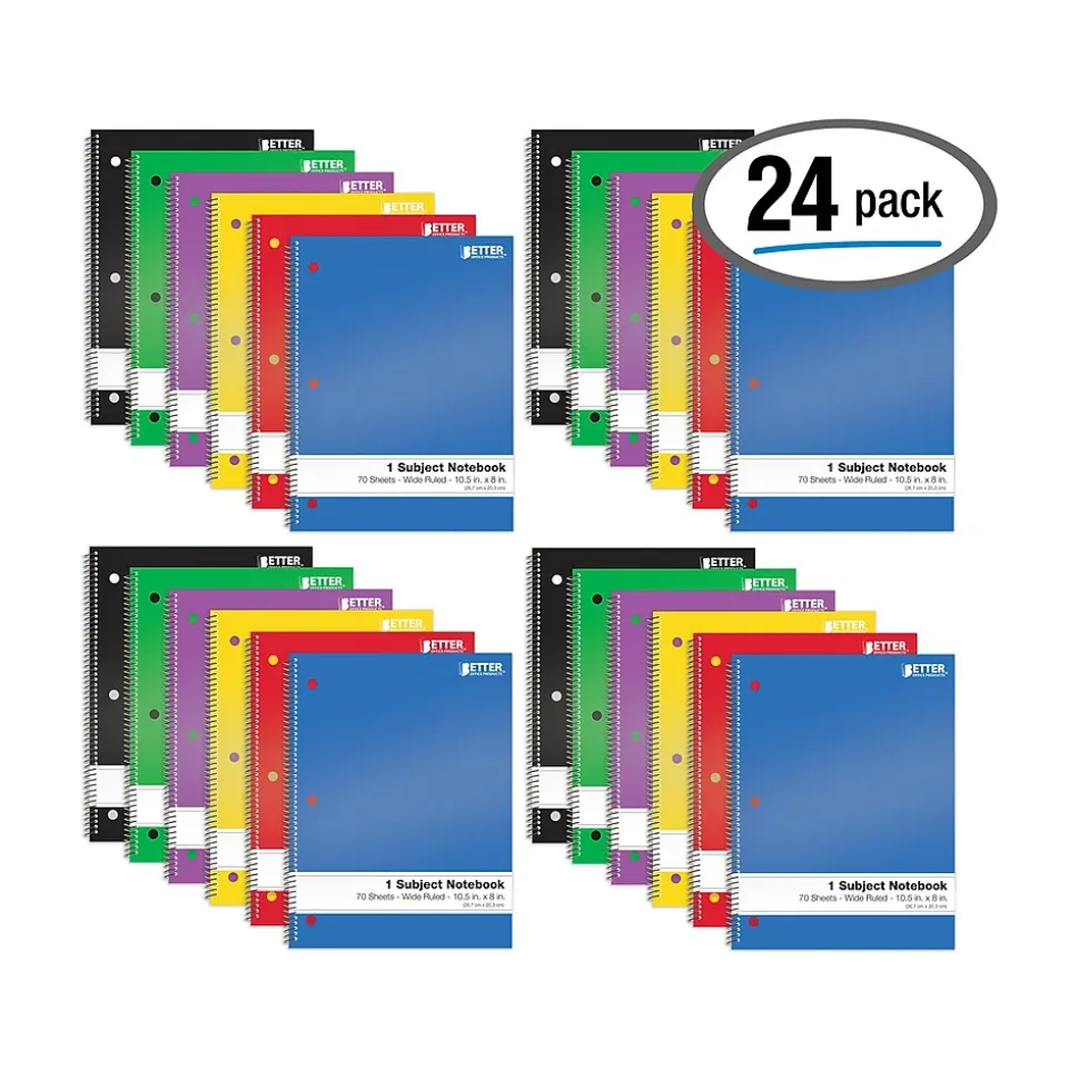 Whether you need notebooks for school, home, or office use, Better Office offers quality products at superb value. These spiral-bound notebooks come in six solid colors: black, blue, red, yellow, green, and purple (four of each color). Sturdy paperboard front and back covers protect your notes and provide a sturdy surface when fixed surfaces aren’t handy. The notebooks are three-hole punched to fit a standard-size three-ring binder with a snag-free coil binding. The sheets feature wide ruling in blue and are perforated along the left margin for easy removal.