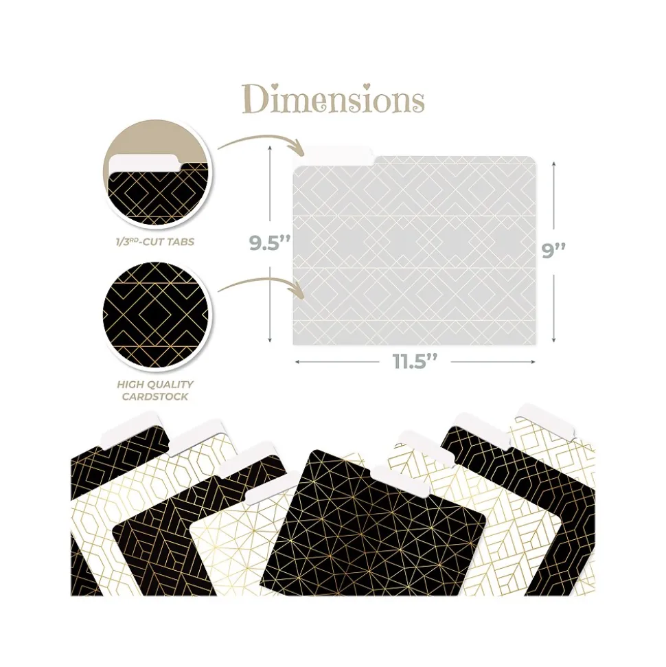 - Features unique prints of four eye-catching Geometric Gold Foil designs on a black background and white background (eight sets of three matching folders)