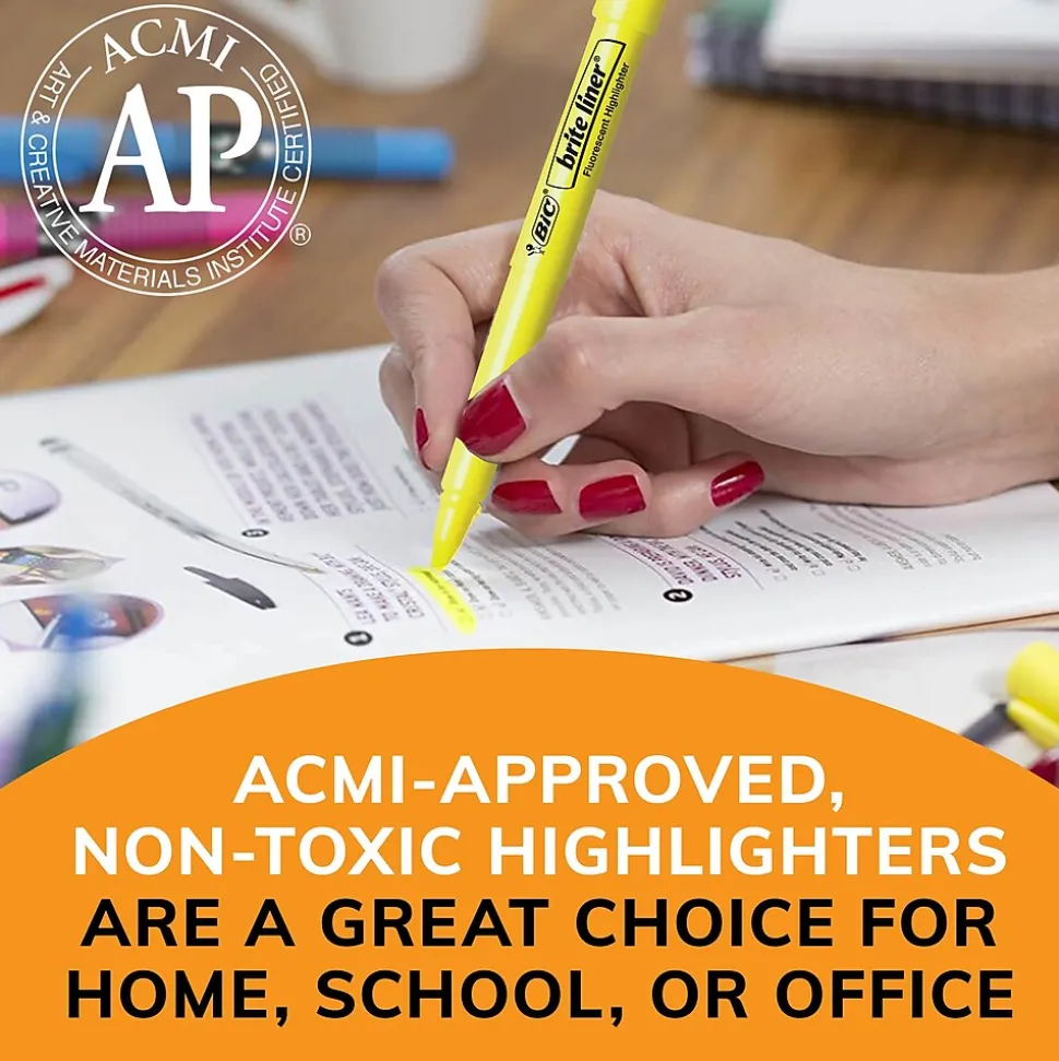 Whether you’re organizing your notes or underlining passages in a textbook, BIC Brite Liner Highlighters make highlighting fun and easy. These highlighters come in five highly visible, fluorescent colors, like our iconic yellow highlighters, allowing you to easily color-code and emphasize information. Each highlighter has a versatile, firm chisel tip that allows you to seamlessly switch between broad highlighting and precise underlining. BIC Brite Liner Highlighters can be left uncapped for up to eight hours without drying out. And thanks to their convenient pen-shaped design, these fluorescent highlighters are easy to grip and use.